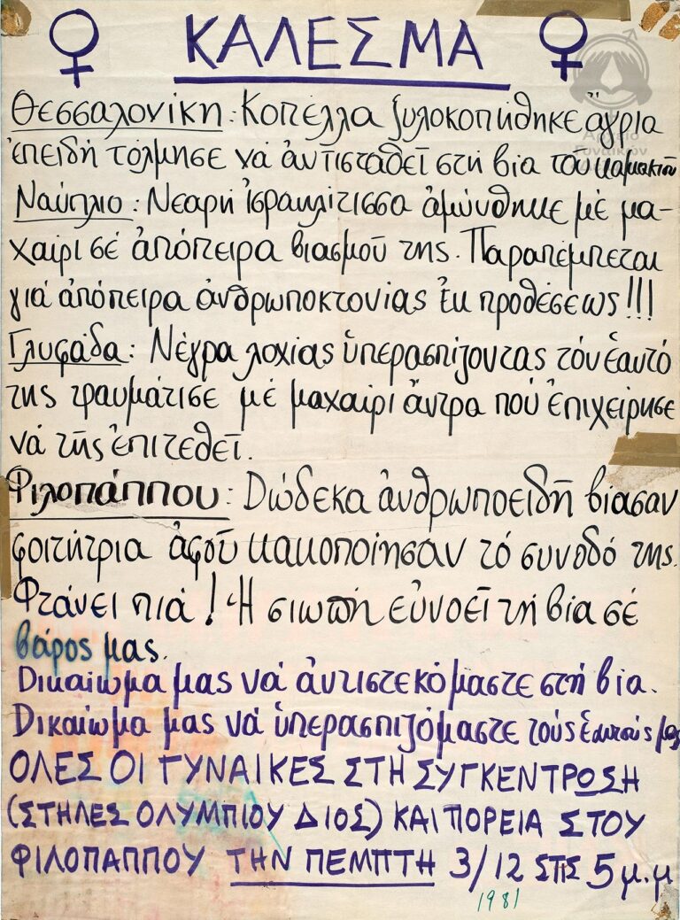 …Προσπάθησα να εντοπίσω ηχητικά τεκμήρια από τις διαδηλώσεις των αρχών της δεκαετίας του 1980 στις υπάρχουσες φεμινιστικές αρχειοθετήσεις, αλλά δεν έχω καταφέρει μέχρις στιγμής να βρω κάτι σχετικό. Το Ιστορικό Αρχείο της πρώην Γενικής Γραμματείας Ισότητας των Φύλων, το Αρχείο Γυναικών “Δελφύς”, η Έκθεση του Ιδρύματος της Βουλής για τον Φεμινισμό στα χρόνια της Μεταπολίτευσης, 1974-1990, και το This is not a feminist project περιλαμβάνουν αρκετά σχετικά τεκμήρια από αυτές τις κινητοποιήσεις, τα οποία είναι όμως κειμενο-κεντρικά και σε κάποιες περιπτώσεις οπτικο-κεντρικά.