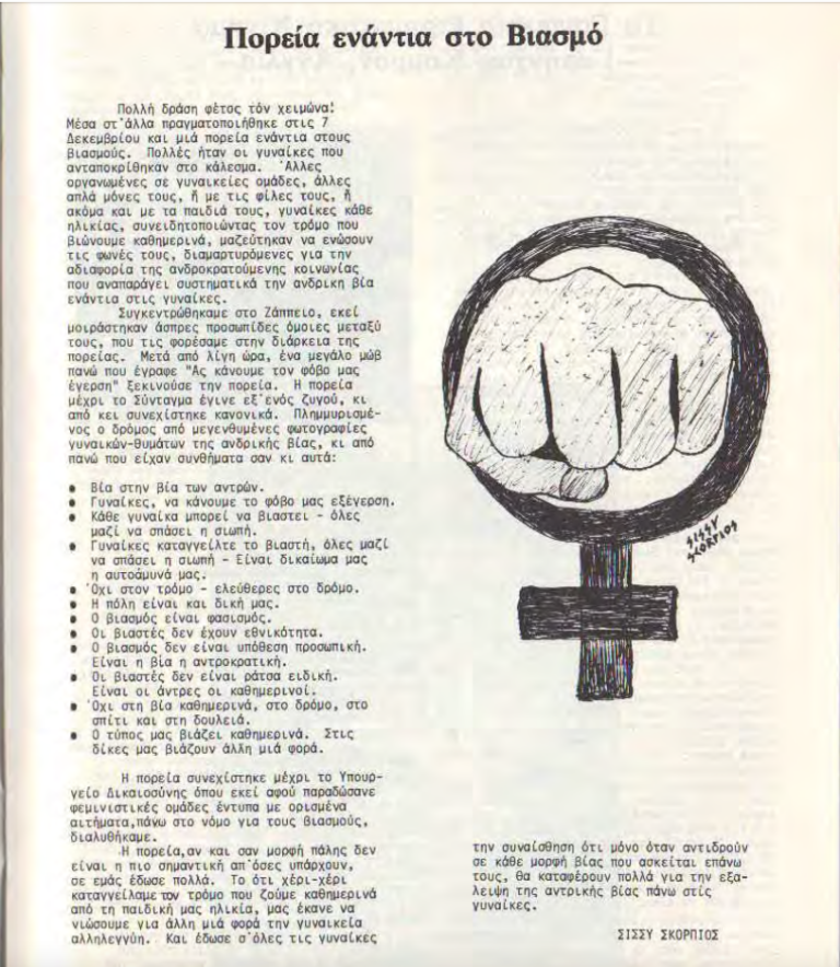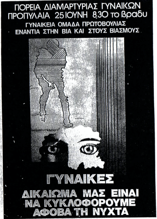 “From the 1970s discourses of autonomous feminists centring on male violence to the anti-rape claims of anarchist feminists in 2016, violence against feminine bodies and the reclaiming of public space, all emerge as continuous claims of an unfinished feminist emancipation, one that acknowledges the performative force of an anti-rape feminist rage coming from 1980s autonomous feminism and re-emerging in the present. From the militant and defensive proclamations of autonomous feminists of the late 1980s to the more embodied, inclusive and sex-positive claims of anarchist and lesbian feminists nowadays, it seems that feminist history in Greece can be documented through a non-linear ethnographic/ historiographical approach, which looks for historical and affective ‘touches’ that form communities of feminist rage across present, past and future. Such an approach to feminist archives and historiography can further reflect anxieties about the past debts of autonomous feminism and the future obligations of queer feminism”. (σελ. 148)